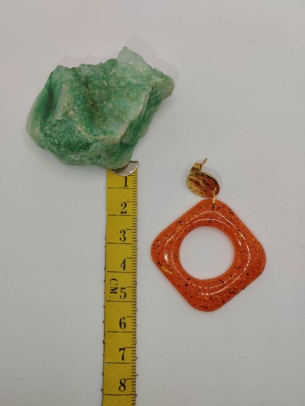 Boucles d'oreilles avec attaches dorées, en pâte polymère de couleur orange tâchetées de noir et de doré, recouvertes de résine.