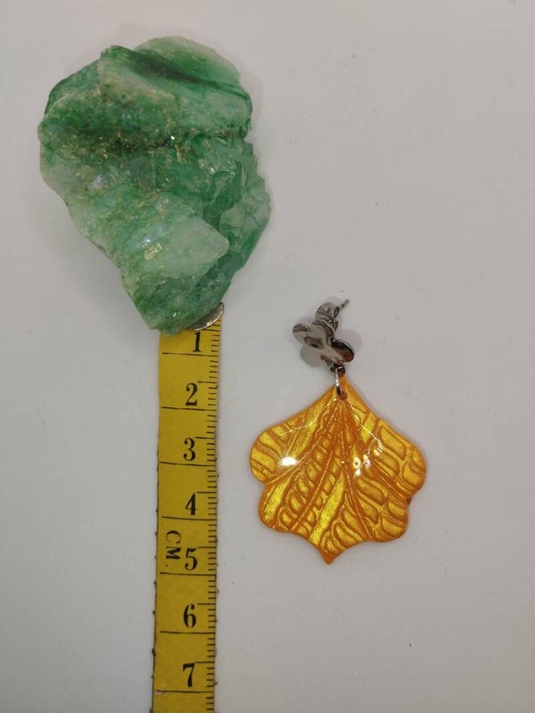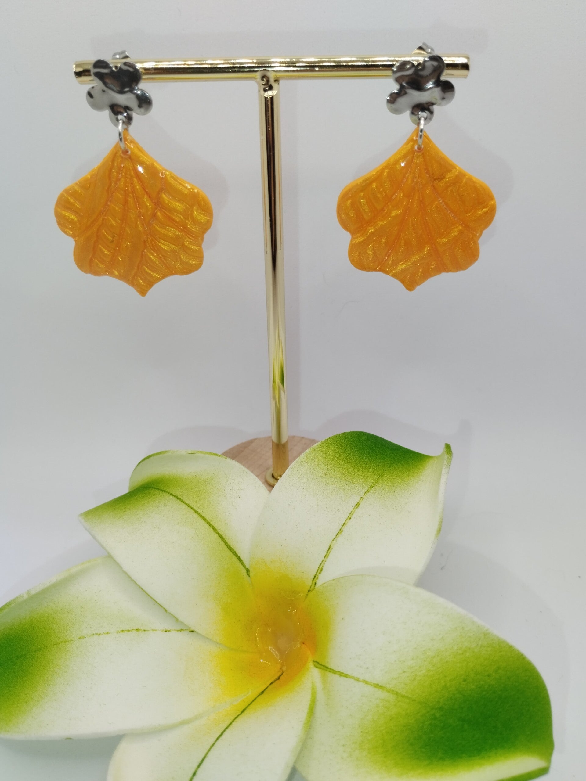 Boucles d'oreilles avec attaches argentées, en pâte polymère orangé recouvertes d'une poudre dorée, finies par une couche de résine.