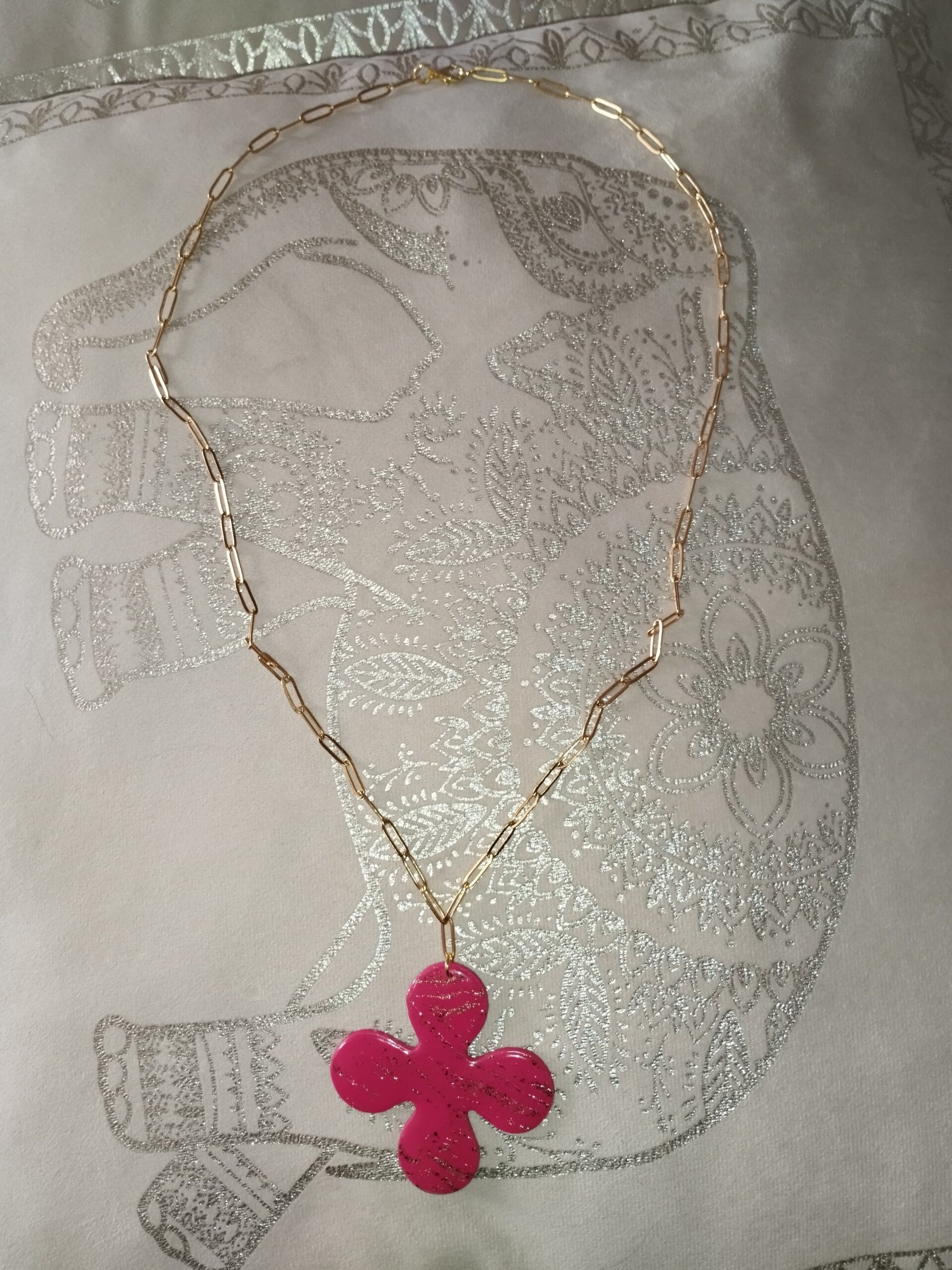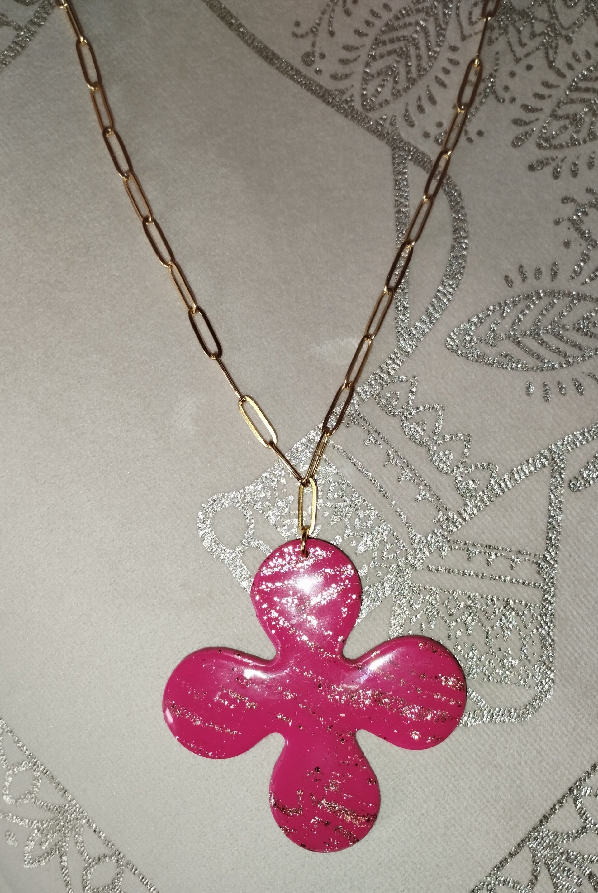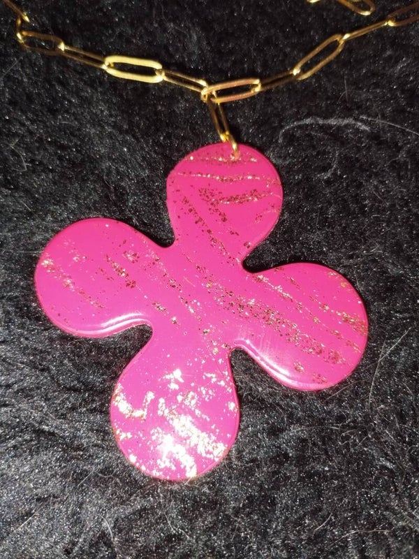 Collier avec une chaine dorée longueur sautoir (possible d'avoir deux autres longueurs voir en option ci dessous), et une fleur en pâte polymère rose mélangée à de la feuille cuivrée.