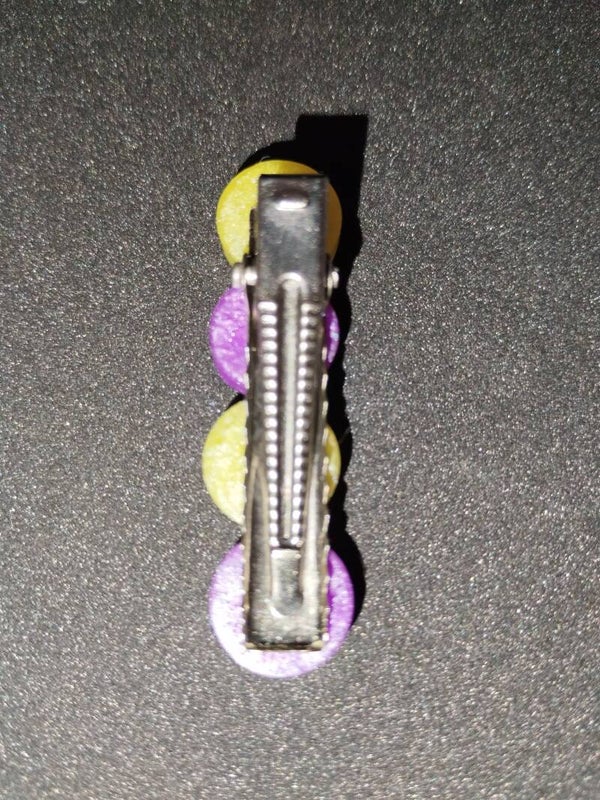 Barrette argentée de 4,5cm avec 4 petits ronds deux jaune et deux violets en résine sur le dessus.