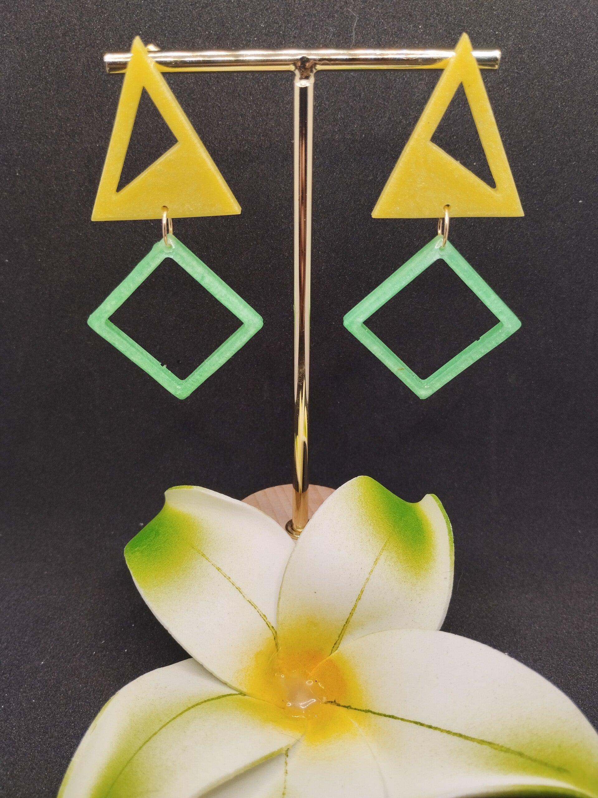 Paire de boucles attaches dorées 100% en résine avec poudre colorante jaune et verte