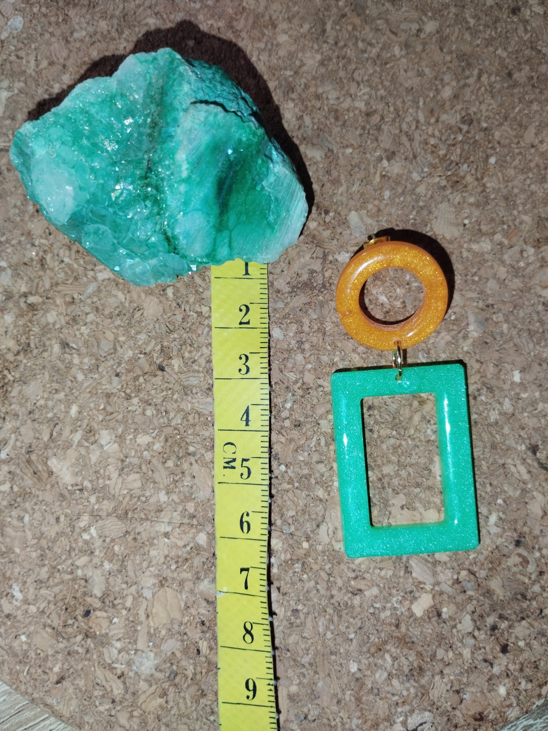 Paire de boucles attaches dorées 100% en résine avec poudre colorante orange et verte