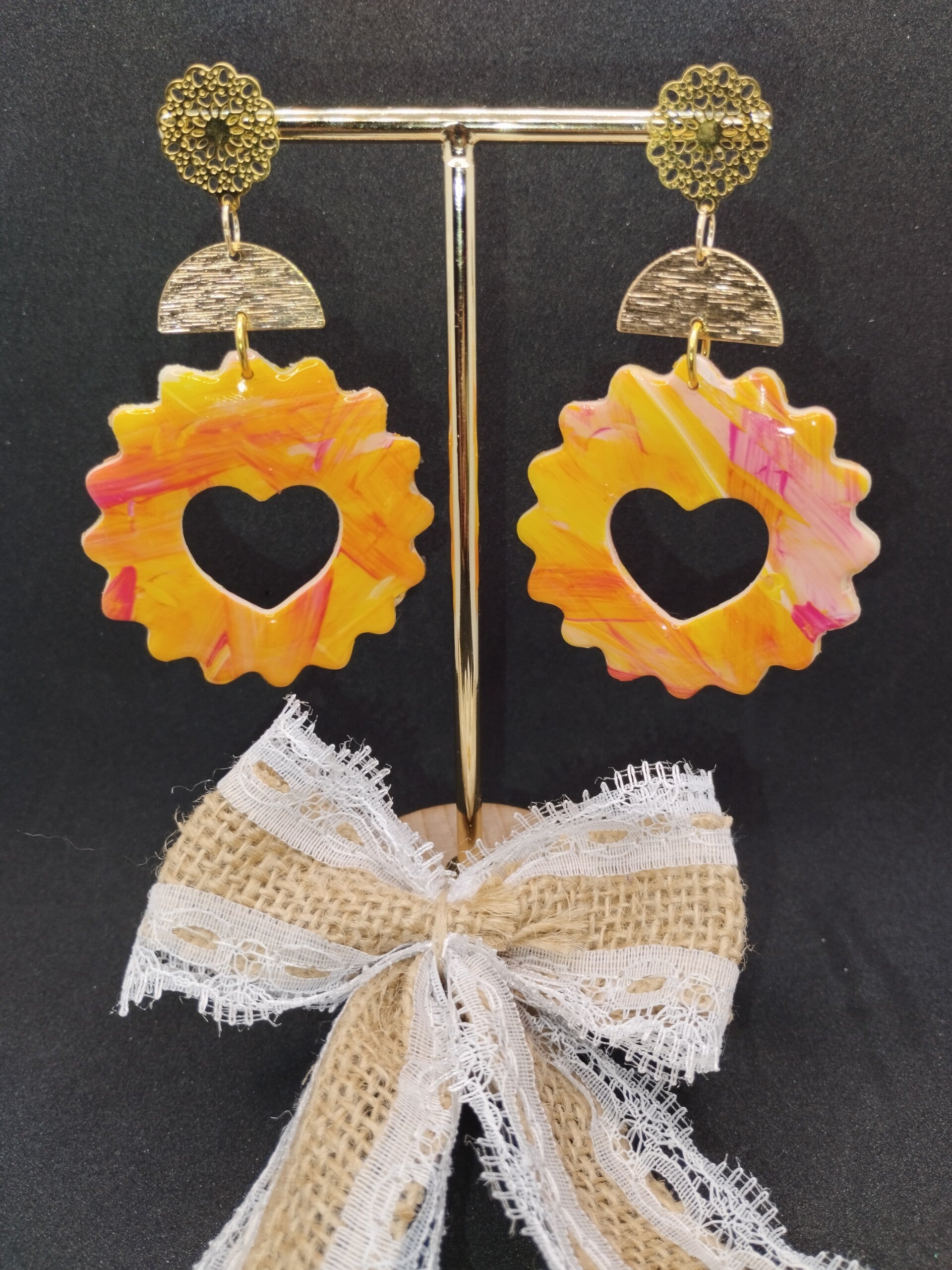 Paire de boucles d'oreilles attaches dorées, joli mélange de pâte polymère et de peinture pour un effet coucher de soleil ❤️🧡💛