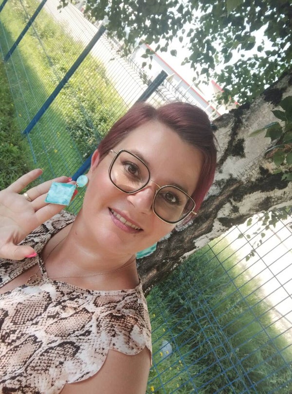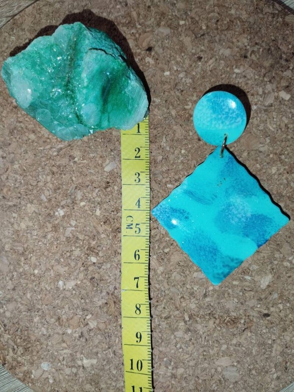 Paire de boucles d'oreilles, attaches dorées, pâte polymère bleue avec tâches de peinture bleue et blanche.