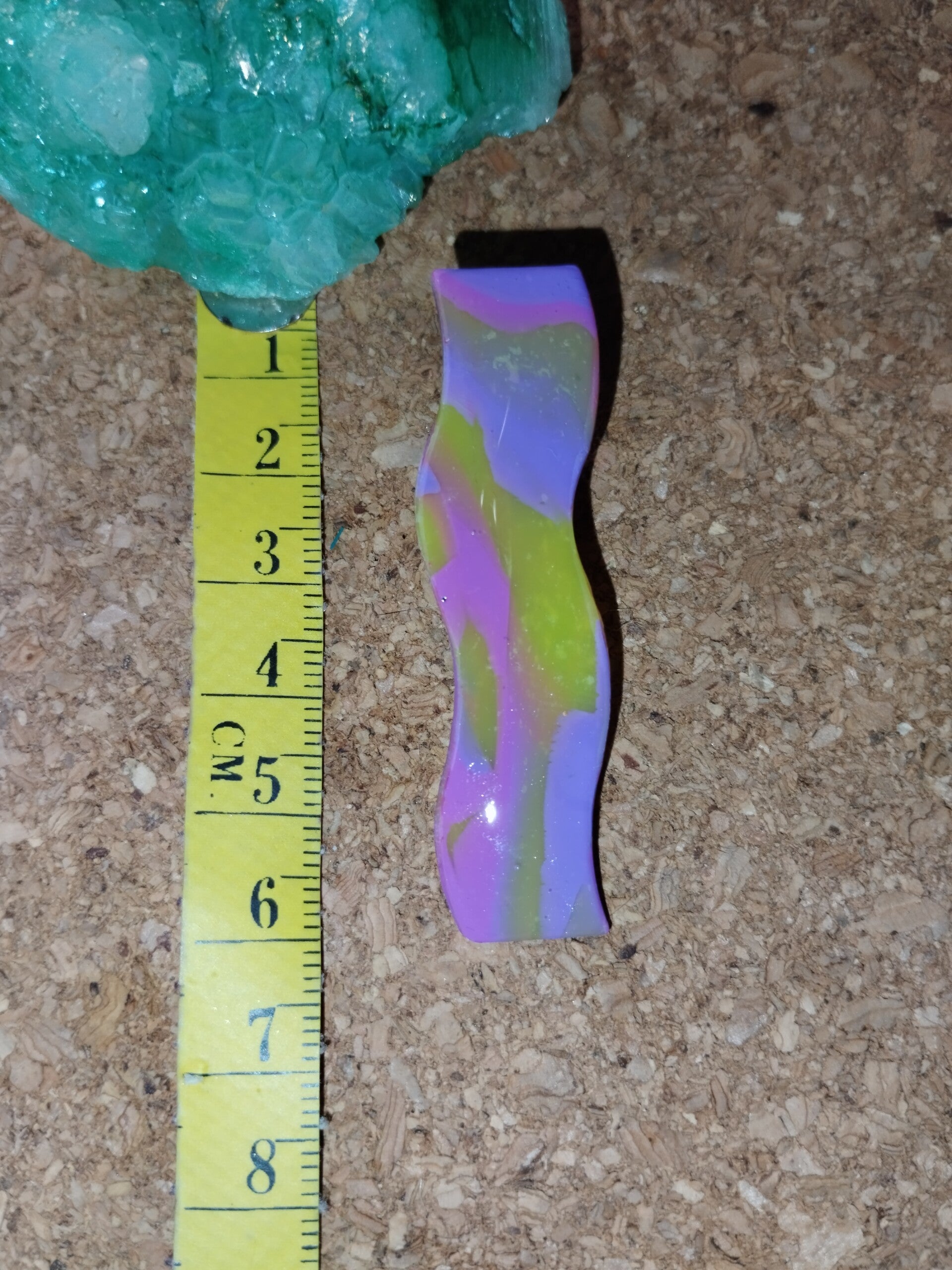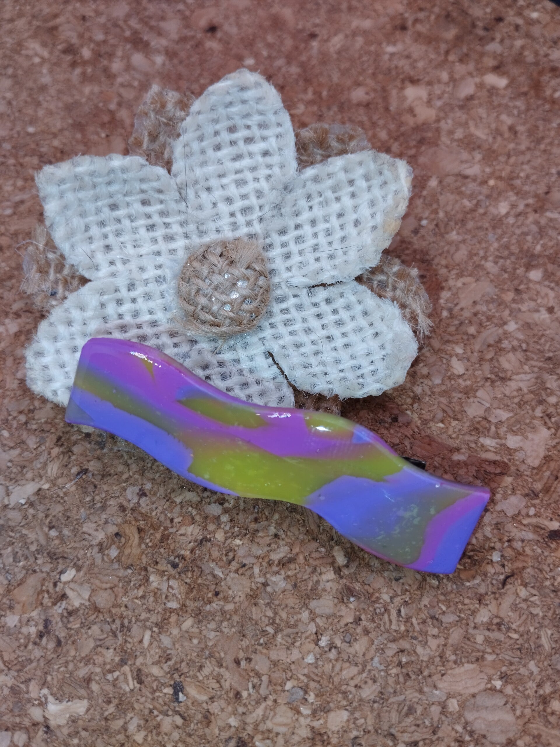 Barrette de 4,5cm avec forme en pâte polymère violette et jaune sur le dessus.