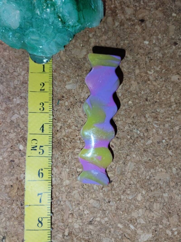Barrette de 4,5cm avec forme en pâte polymère violette et jaune sur le dessus.