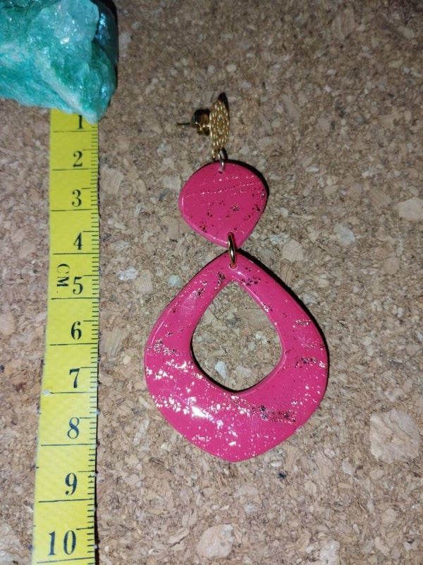 Paire de boucles d'oreilles, avec attaches dorées, couleur rose framboise et feuille dorée.