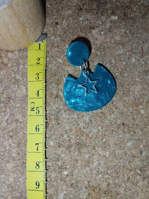 Paire de boucles d'oreilles, attaches argentées, pâte polymère bleu canard avec de la poudre argentée, accessoirisé d'une étoile et recouvertes de résine.
