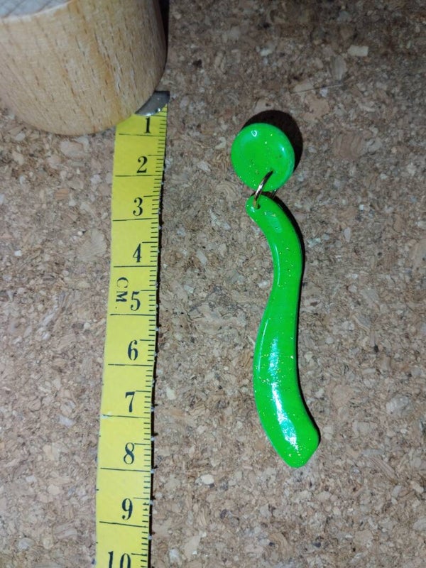 Paire de boucles d'oreilles, attaches dorées, pâte polymère verte flashy avec feuille dorée recouvertes de résine