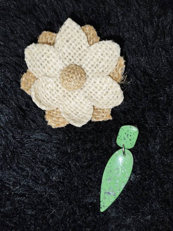 Paire de boucles d'oreilles, attaches argentées, pâte polymère verte a points noirs, recouvertes de résine.