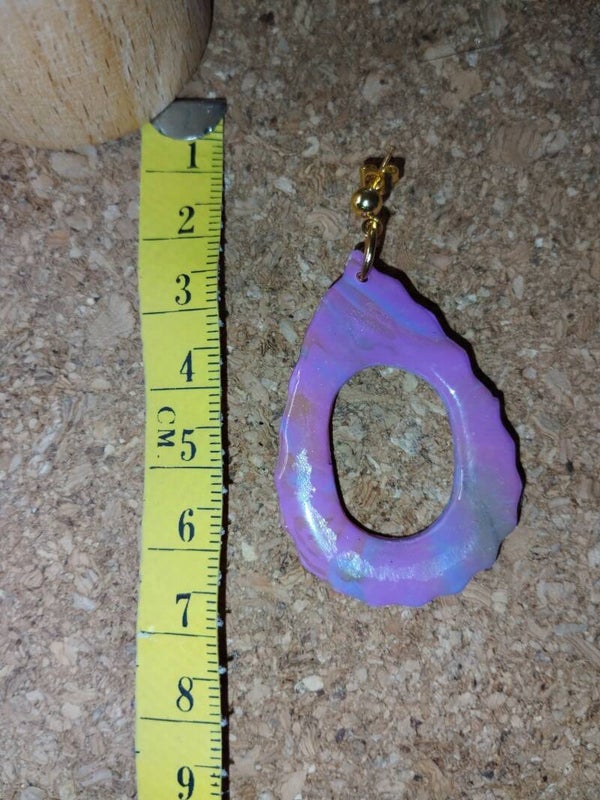 Paire de boucles d'oreilles, attaches dorées, pâte polymère jaune et violette, recouvertes de résine.