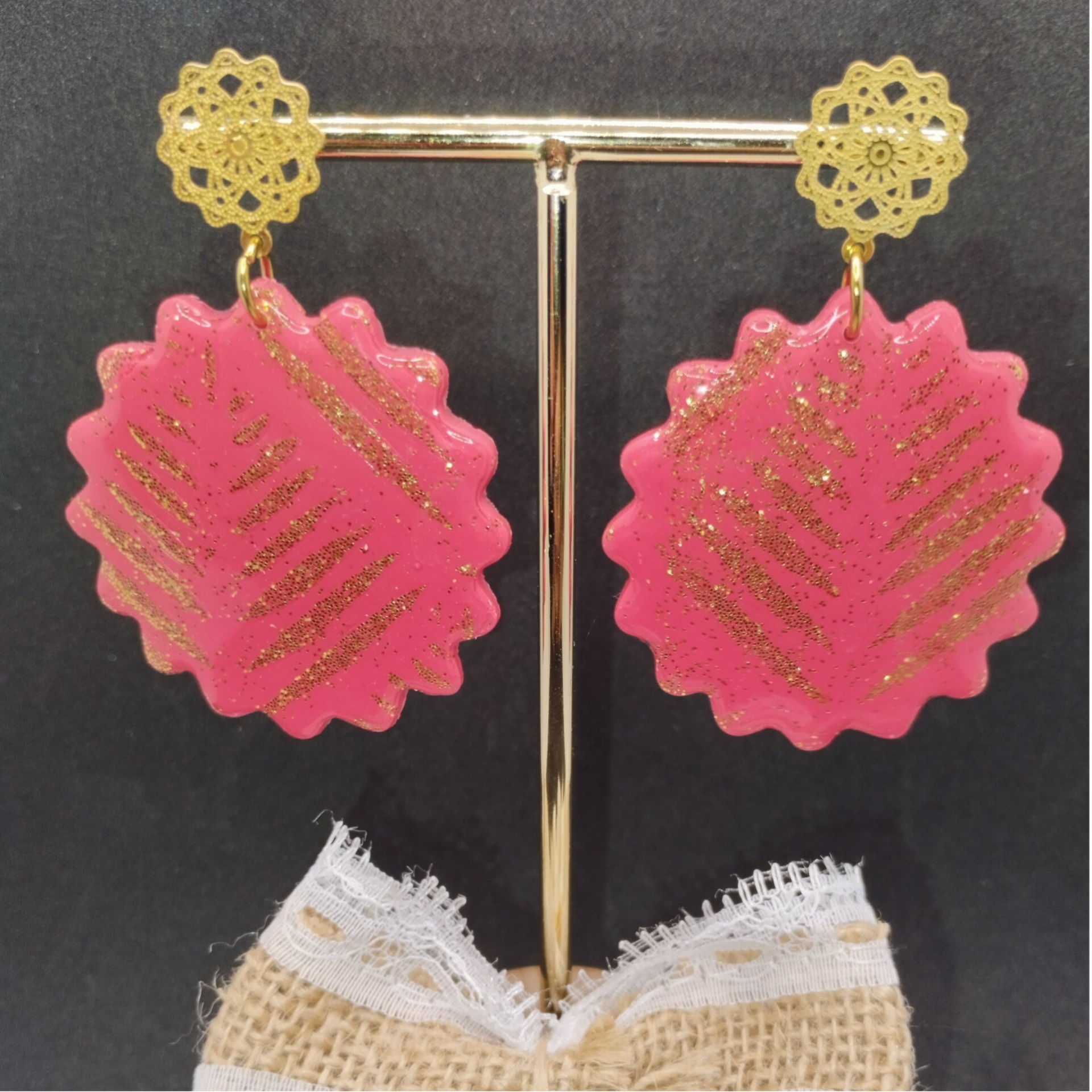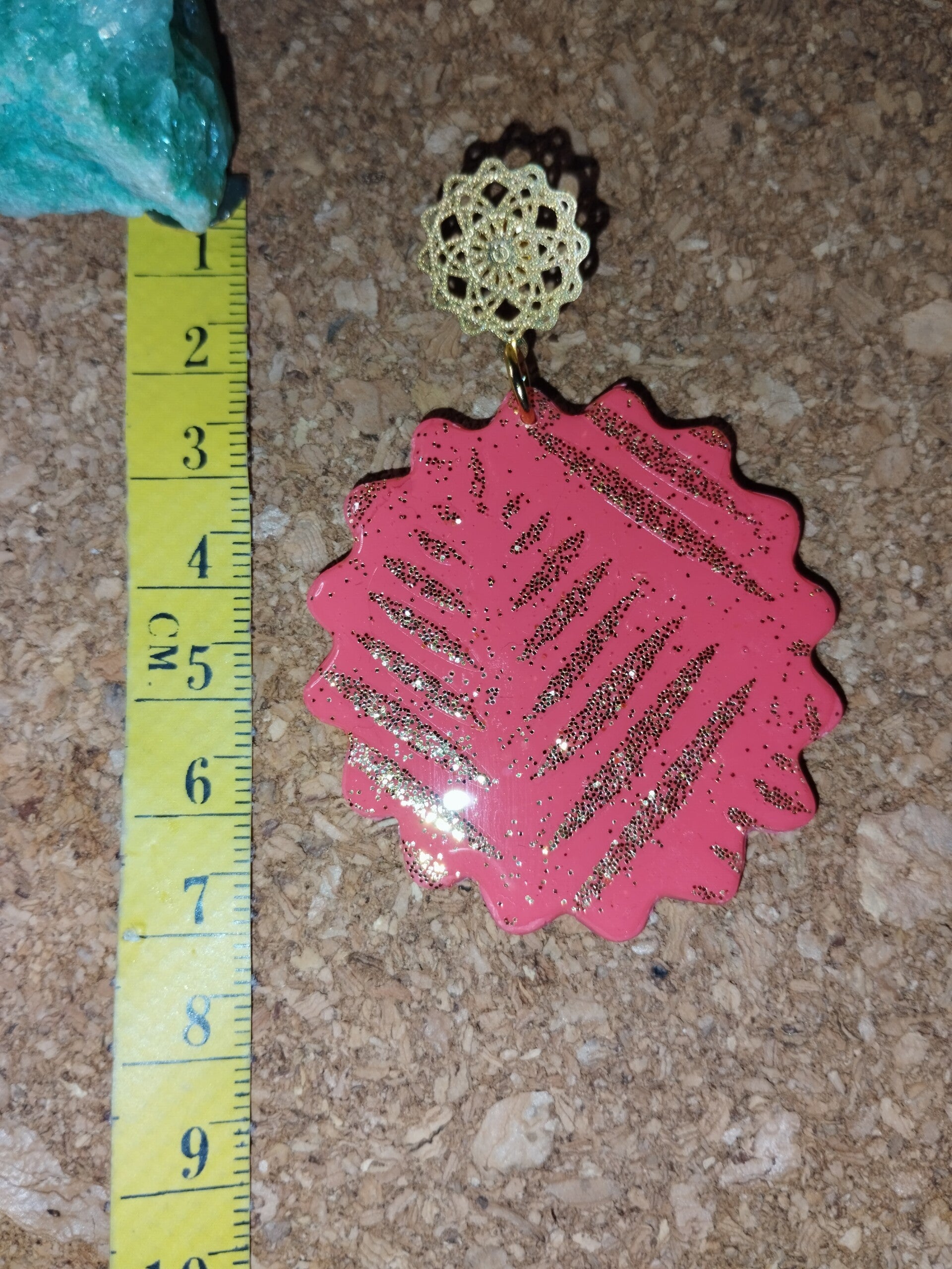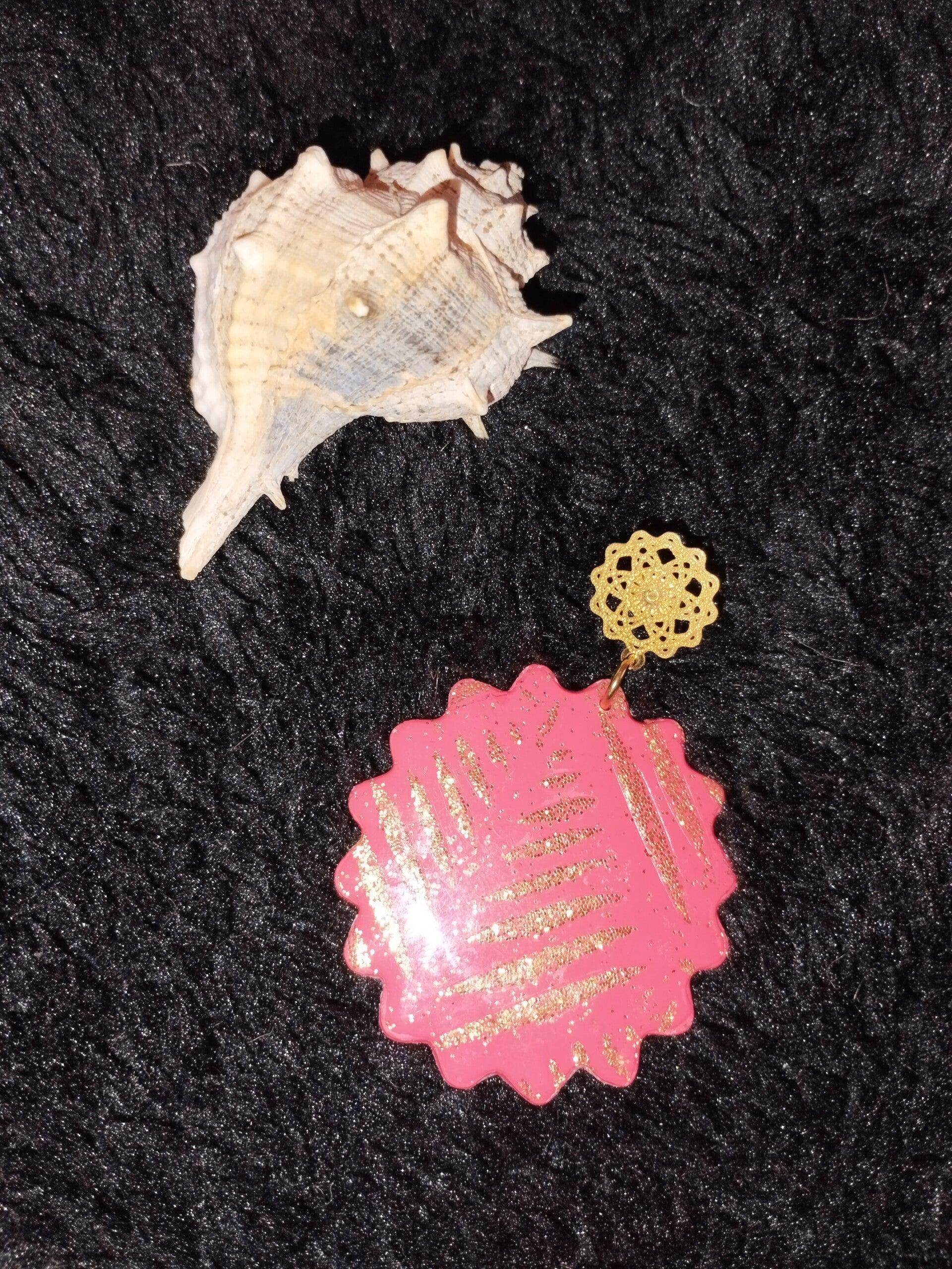Paire de boucles d'oreilles, attaches dorées, pâte polymère corail, motif à paillettes dorées, recouvertes de résine.