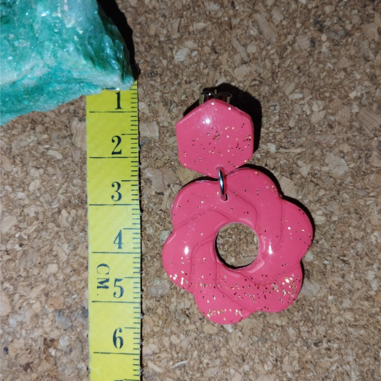 Paire de boucles d'oreilles, attaches argentés, pâte polymère corail, avec paillettes dorées, et recouvertes de résine.