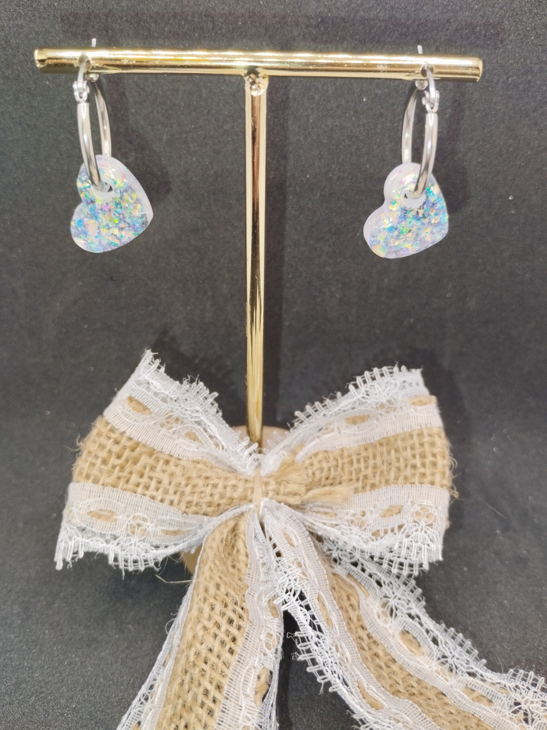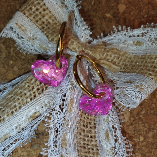 Jolie paire de créoles 2 ou 3 cm, dorées ou argentées, avec deux minis coeurs en résine et 100% FULL GLITTER