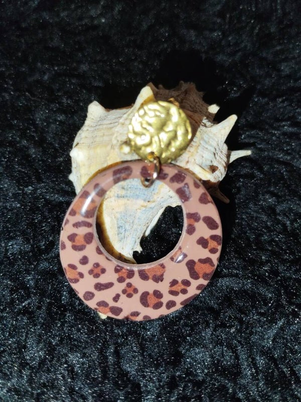 Paire de boucles d'oreilles, de forme ronde, attaches dorées. Pâte polymère marron claire, avec un motif léopard marron et noir.