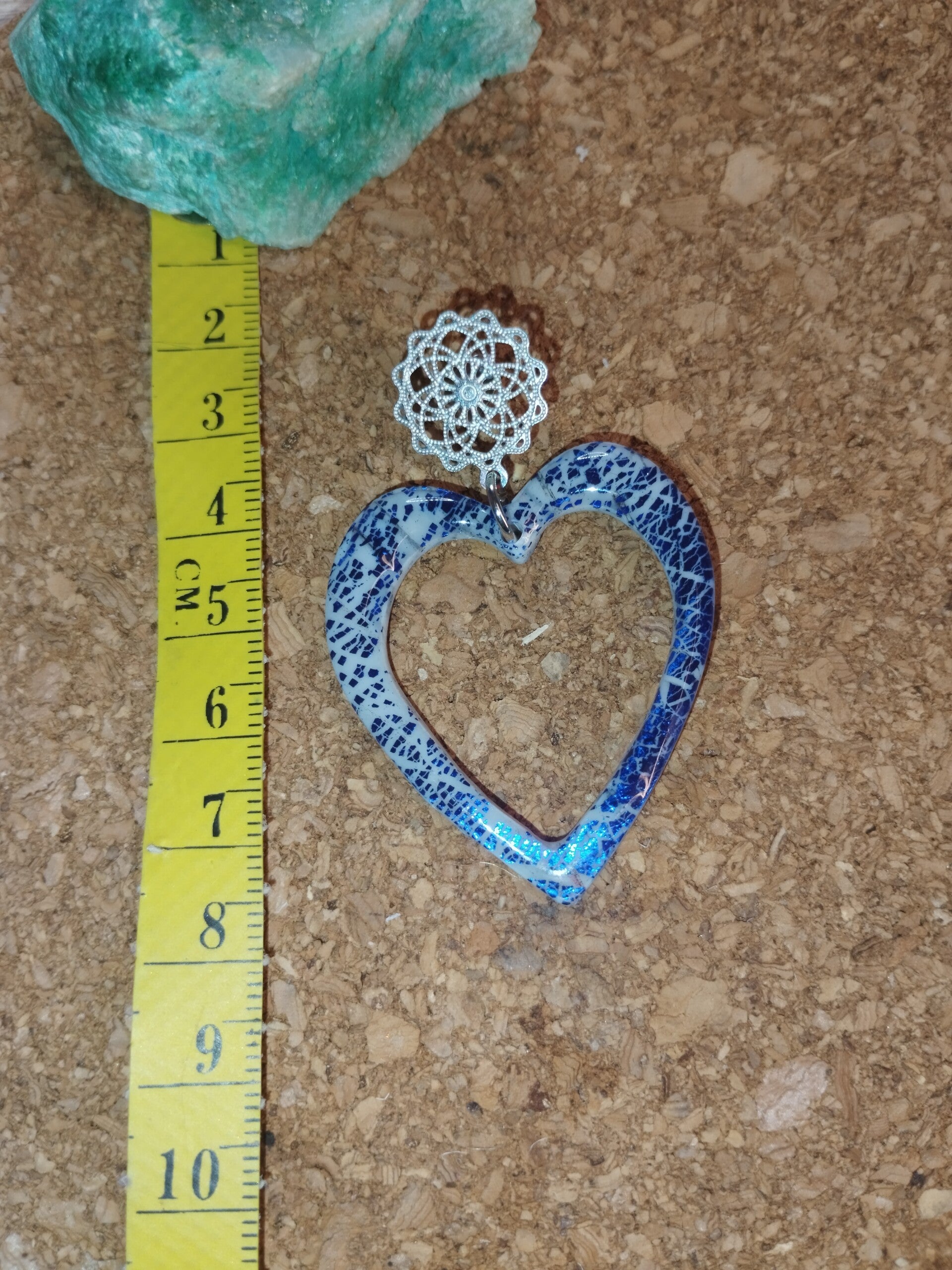 Paire de boucles d'oreilles geand coeur en pâte polymère grise et feuille bleue.