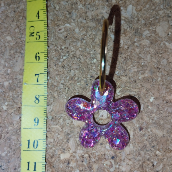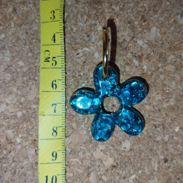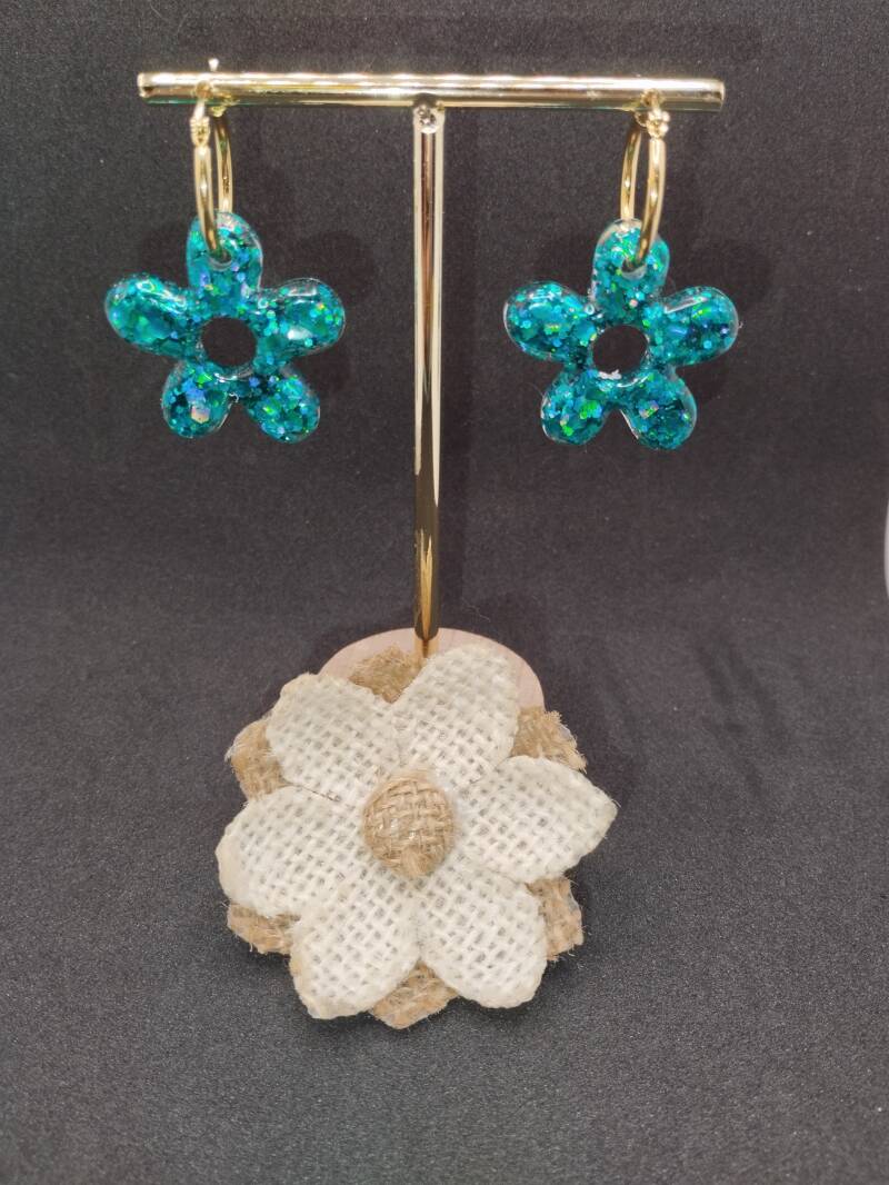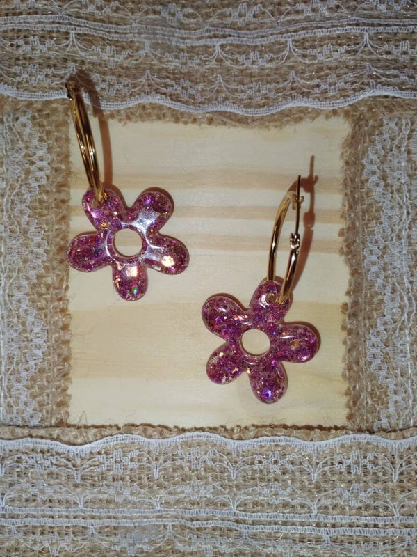 Creoles dorées ou argentées, 2 ou 3 cm de diamètre avec une fleur Pervenche 100% résine en FULL GLITTER