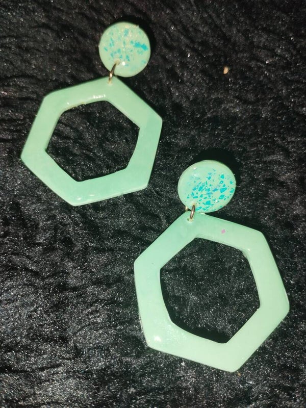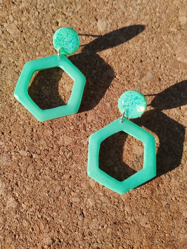 Jolie paire de boucles d'oreilles en forme d'hexagone, et le petit rond est recouvert de paillettes.