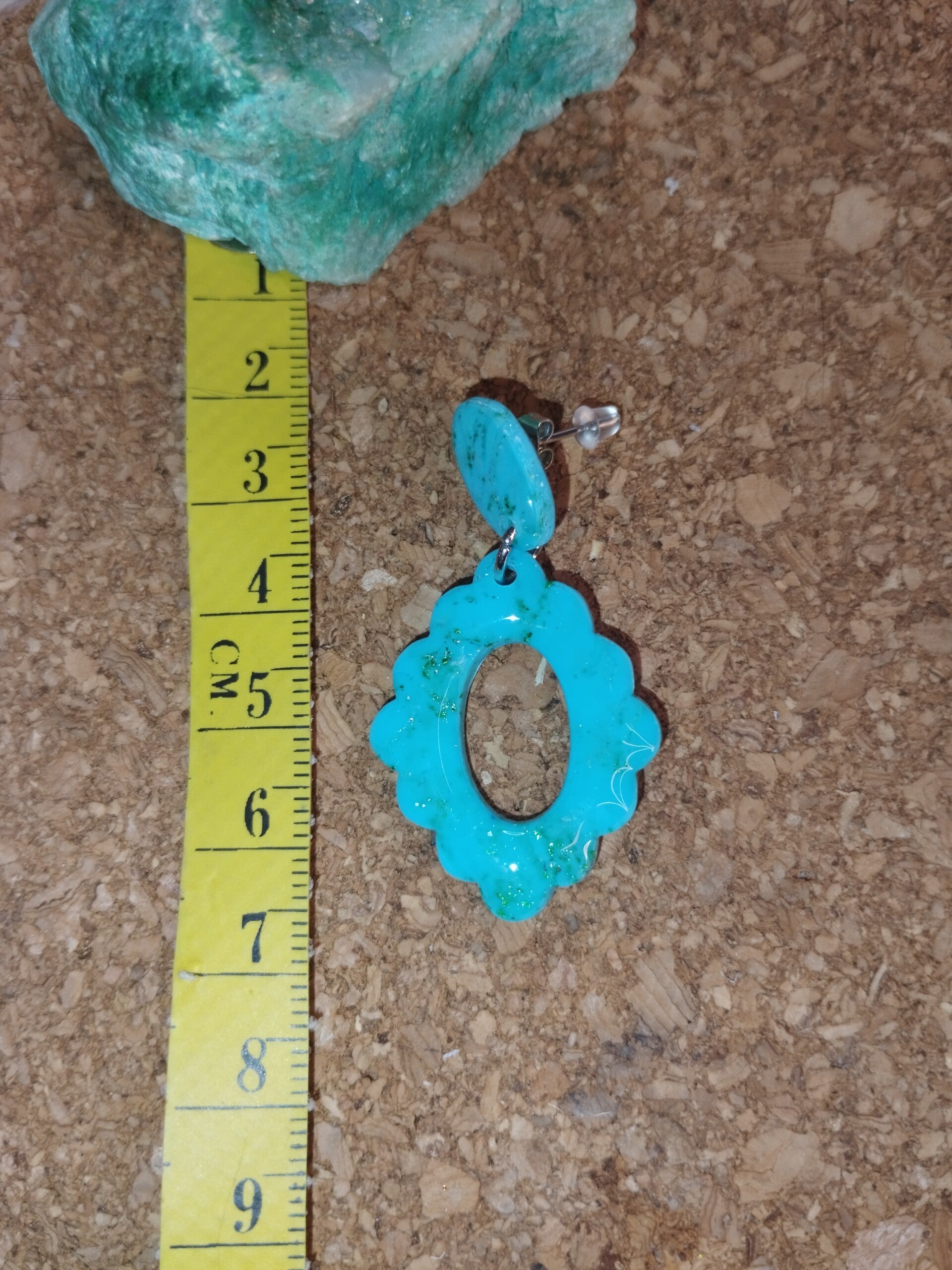 Jolie paire de boucles en pâte polymère bleu ciel avec feuilles argentées et vertes, attaches argentées, le tout recouvert de résine.