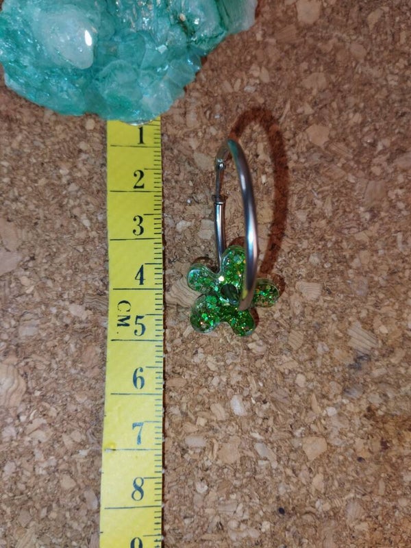 Jolie paire de créoles 2 ou 3 cm, dorées ou argentées, avec deux minis fleurs en résine et 100% FULL GLITTER