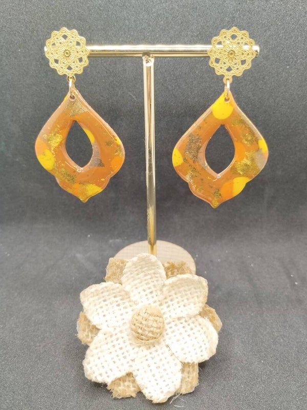 Jolie paire de boucles d'oreilles en pâte polymère marron avec quelques touches de jaune orange et bordeaux et de la feuille d'or et de cuivre.